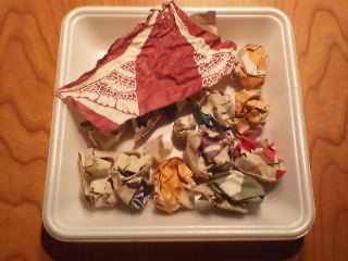 帰宅すると、優しいゆういちろうが「お母さんにたこ焼き3つ残しておいたで」と一番に報告した。テーブルには折り紙でたこ焼きのようなものがあったので、「これ作ってくれたん?」と聞くと、「違うで、たこ焼きは冷蔵庫。これはカレー」とのこと。大きめのつぶつぶご飯にカレーのルーをかけたと説明してくれた。