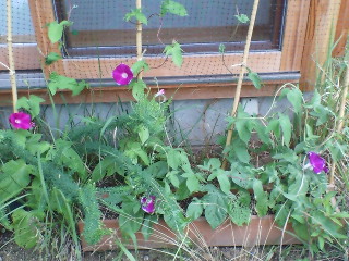 朝10時の朝顔の様子である。しぼみかけだけど、朝顔が咲くと夏休みを思い出して、好きだ。この赤紫色の朝顔は学校で2年生の女子からもらった種から育てたものである。そして、来年は、これら朝顔の種を採って、新一年生にバトンタッチする。網の目が細かすぎて、ちょっとつるが巻きつきにくそう。失敗。麻ひもを何本か横に渡してやればよかった。
